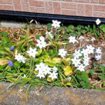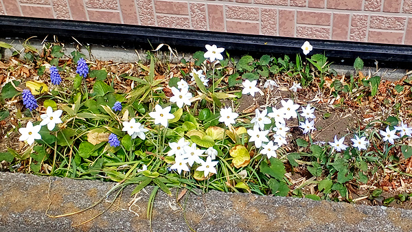 白いお花がハナニラで紫のお花がムスカリです。どちらも春の定番で、丈夫で放置しても毎年咲いてくれます。